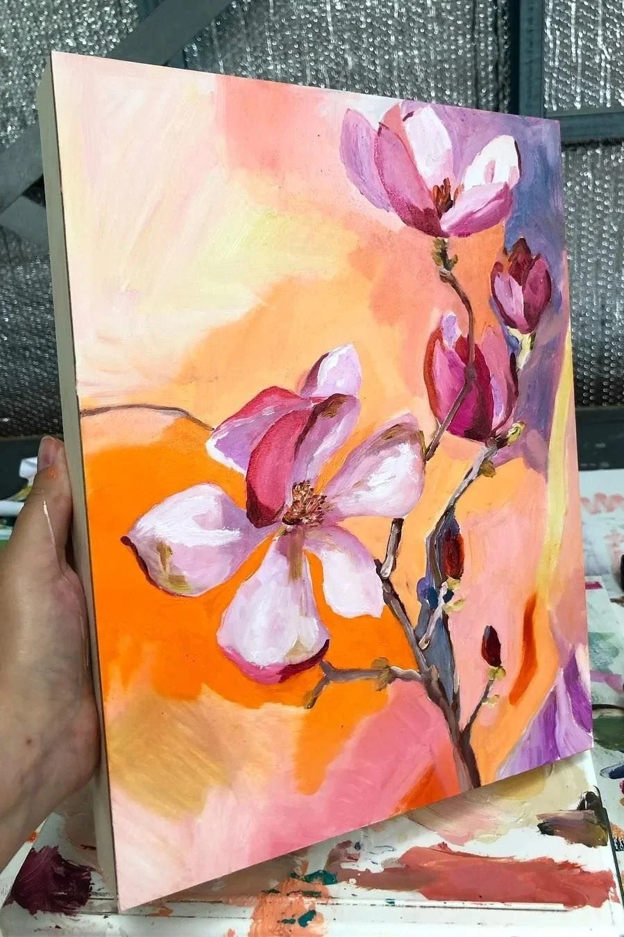 I start with an introduction on the course, including the meaning of specific flowers - I give examples of how to draw the flowers, so you can pick the one that speaks to you! Then we will draw the sketch on canvas. After this, I will explain painting and color mixing. I will also share the effect of colors, so you can purposely choose your palette. We start painting, which I will walk through. Giving tips and answering questions. We apply a background and protection layer.